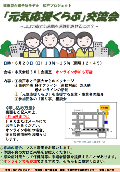 イベント情報 · 2021/05/05 6/20「元気応援くらぶ」交流会 のご案内 「元気応援くらぶ」交流会が令和3年6月20日(日)13時〜15時に、市民会館301会議室で開かれます。奮ってご参加ください。詳しくはPDFファイルをご覧ください。なお、松戸プロジェクトパートナーのニュースレター3月号では、開催が6月26日(土)の開催予定としておりましたが、会場の都合で6月20日(日)に変更になっておりますのでご注意ください。 ※チラシ、お申込用紙につきましてはこのページの下部をご覧ください チラシはこちらよりダウンロードしていただけます 2021.6月27日交流会チラシ.pdf.pdf PDFファイル 1.3 MB ダウンロード お申し込みはこの下のファイルをご利用ください ★「元気応援くらぶ」交流会申 ___5.6____.docx Microsoft Word 38.6 KB ダウンロード 【申込先】都市型介護予防モデル 松戸プロジェクト「交流会」実行委員会 申し込みはこちらへ メール:matsudopj-dantaiunneig@googlegroups.com tagPlaceholderカテゴリ: